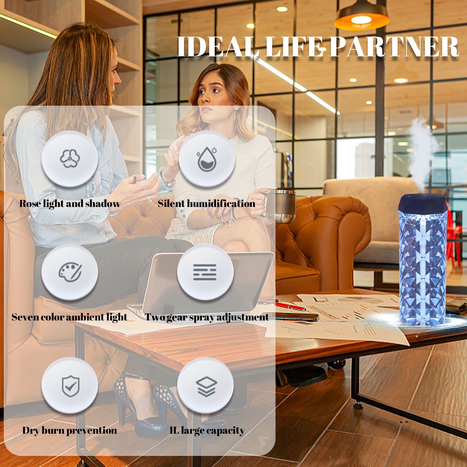 - 2-in-1 Design – Humidifier + Crystal Rose LED Atmosphere Lamp